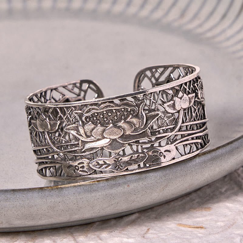 🔮 For When You Need Warmth & Connection | Gentle Focus, Worn Daily. Hollow Lotus Silver Plated Copper Enlightenment Bracelet Bangle | AetherFate