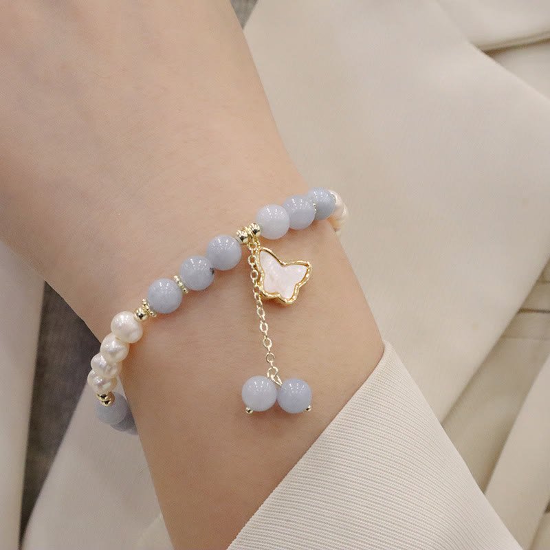 Buddha Stones Natural Aquamarine Pearl Healing Ginkgo Leaf Butterfly Charm Bracelet