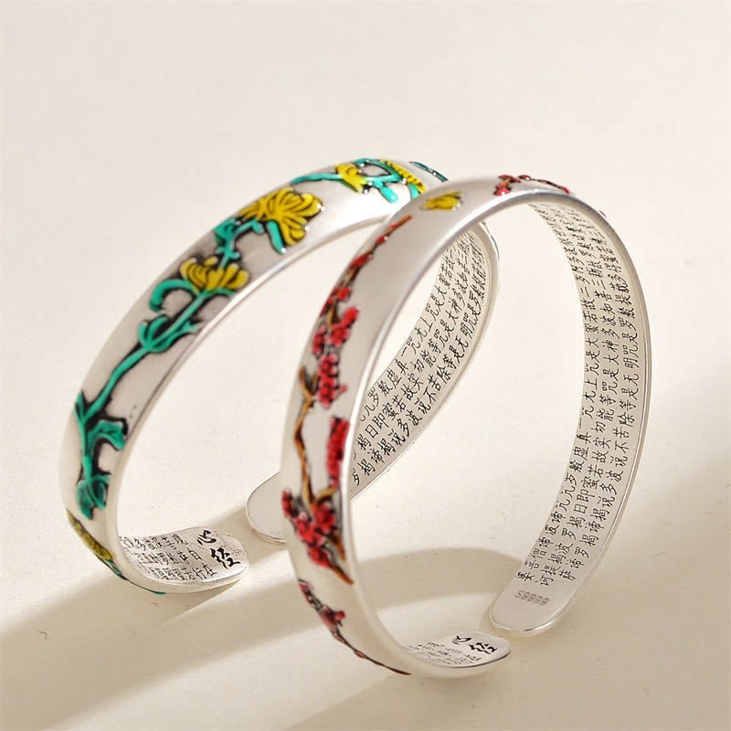 For When You Need Quiet Presence | Plum Blossom Chrysanthemum Flower Design Heart Sutra Bracelet Cuff Bangle