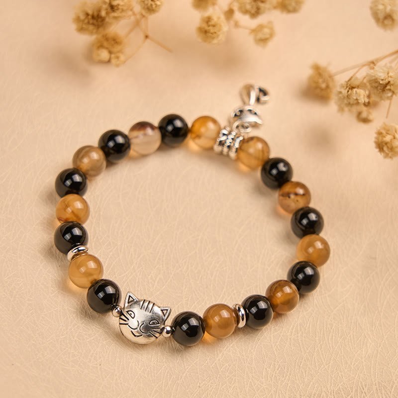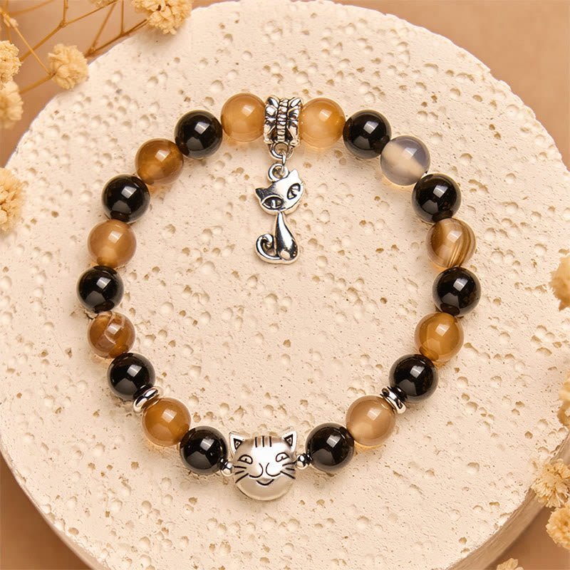 For When You Need Steady Presence | Tortoiseshell Cat Light Brown Striped Agate Black Onyx Bracelet